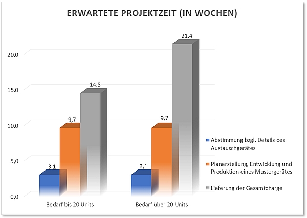 Für die Festlegung der Gerätedetails werden kundenseitig somit etwa 3 Wochen veranschlagt. Bis zur Produktion eines ersten Mustergerätes kommen danach nochmals ca. 6-7 Wochen hinzu. Für die gesamte Projektlaufzeit kalkulieren die Kunden mit einem Zeitraum von ca. 3-4 Monaten bei bis zu 20 Units und ca. 5 Monaten bei Stückzahlen, die darüber hinaus gehen. Das ist aus unserer Sicht durchaus realistisch, wobei nach unserer Erfahrung die notwendige, interne Abstimmung beim Auftraggeber die Abwicklung im avisierten Zeitfenster dann oftmals doch verlängert.